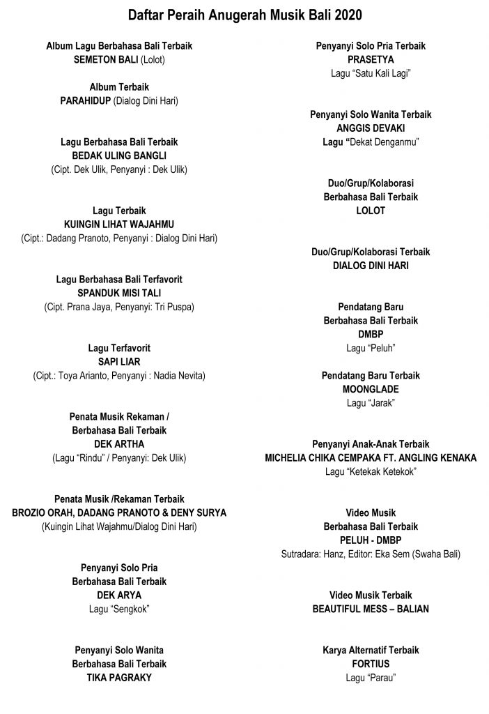 Nah berikut ini adalah para pemenang nominasi Anugerah Musik Bali 2020 yang berlangsung di Gedung Darma Negara Alaya, Denpasar